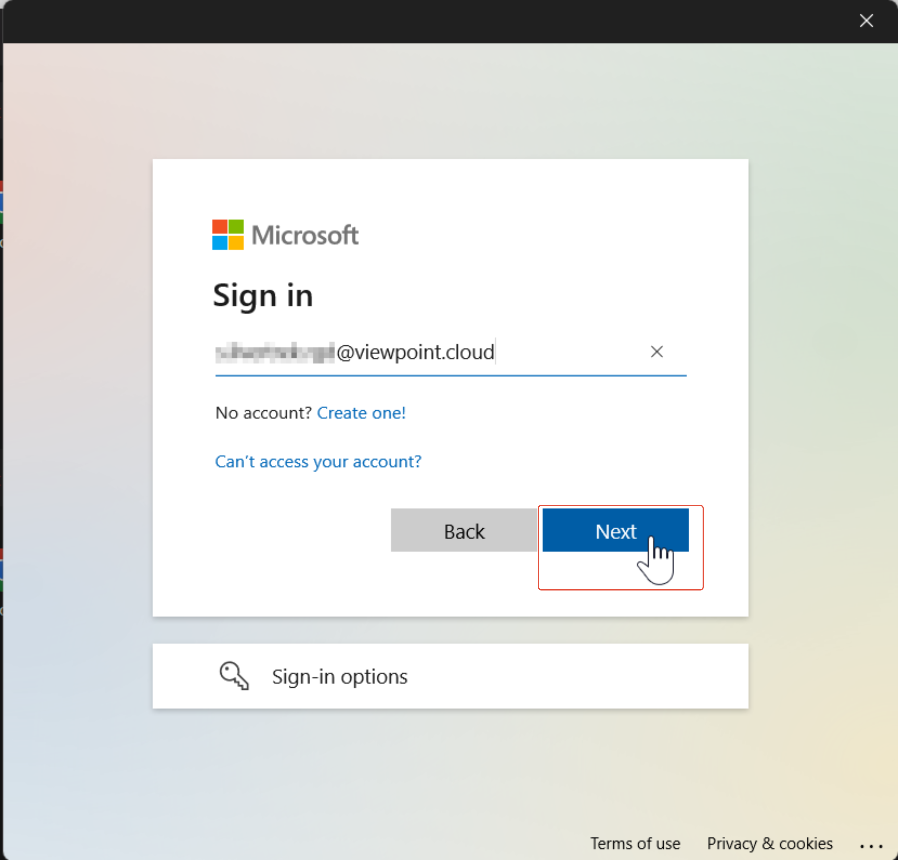 For Silvertrek, the company code is "jate". So the account name will be in the form of: f.lastname.jate@viewpoint.cloud - After entering the viewpoint.cloud email address, hit next.