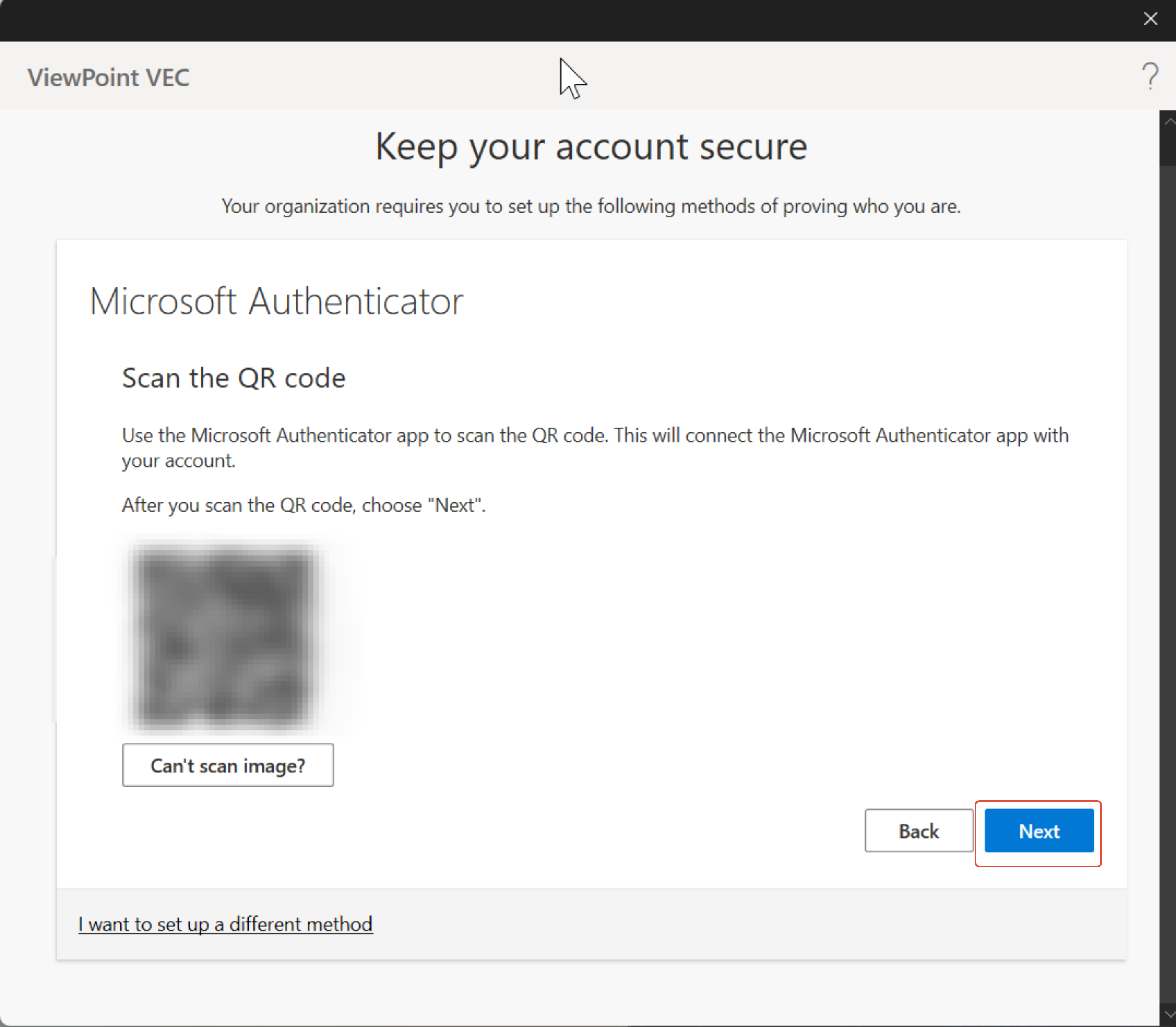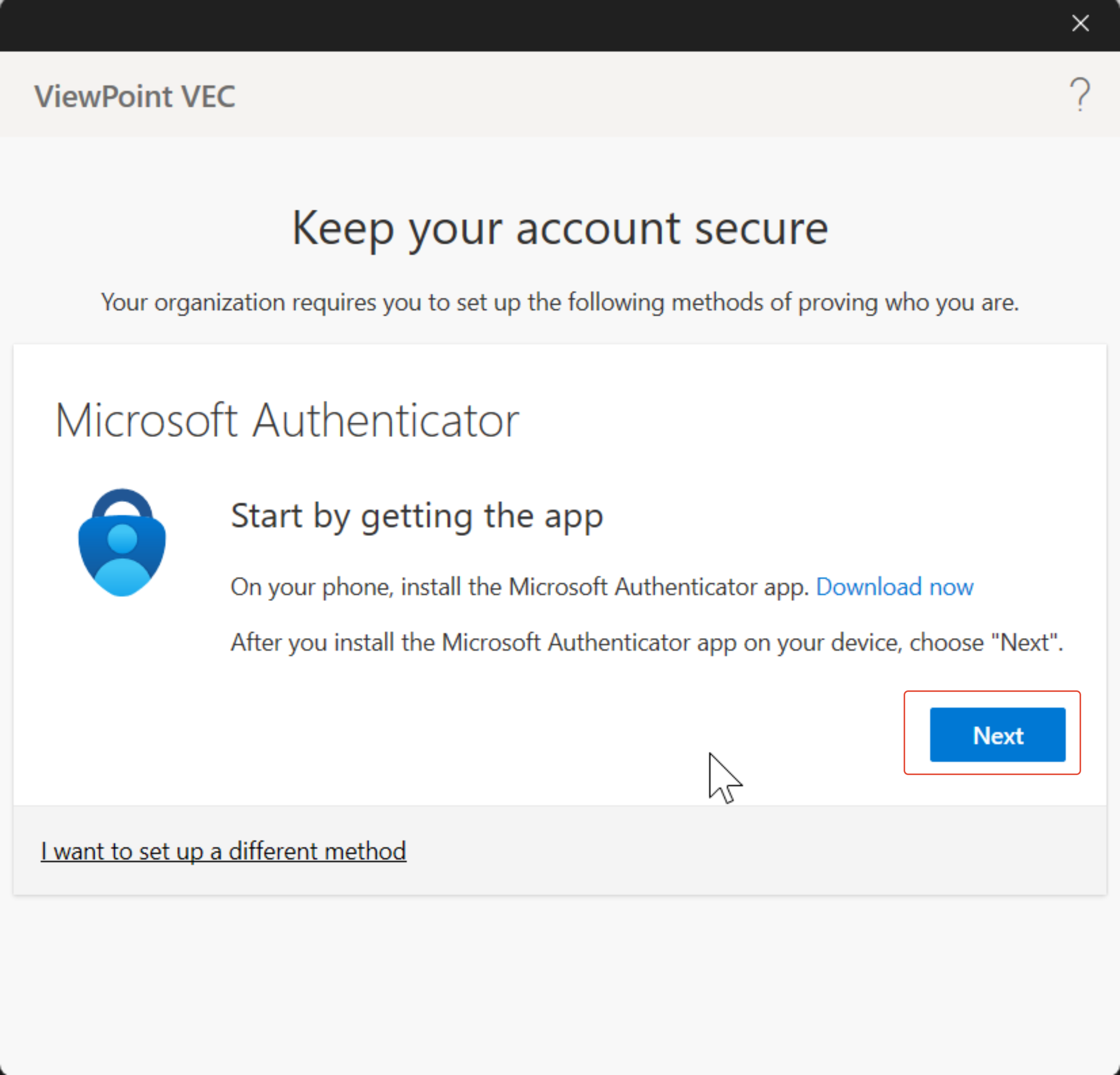 - On the next screen, it will ask you to download the Microsoft authenticator app. This is for two-factor authentication. (Feel free to use whatever authenticator app you prefer, by hitting the alternate option in the bottom left corner.) Install Microsoft Authenticator app (or your preferred authenticator app) on your phone and hit Next