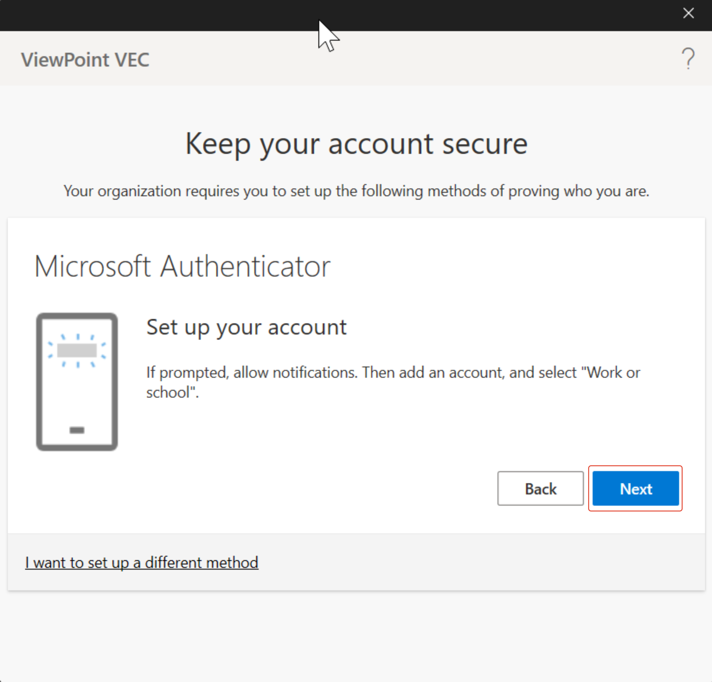 - Set up your Microsoft Authenticator account, and hit Next again