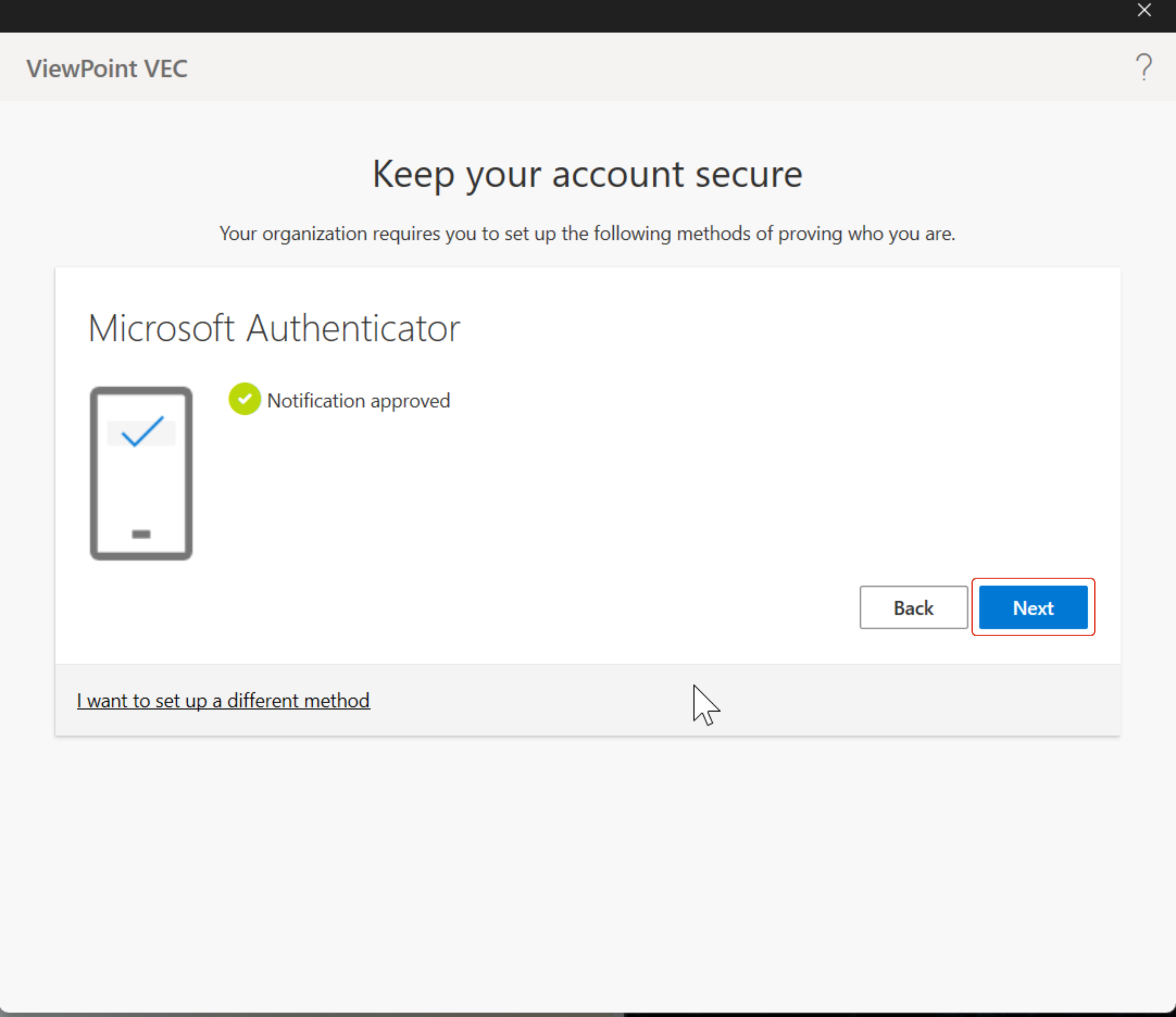 - If sign in was successful, you will see a screen pop up saying "More information required". Hit Next