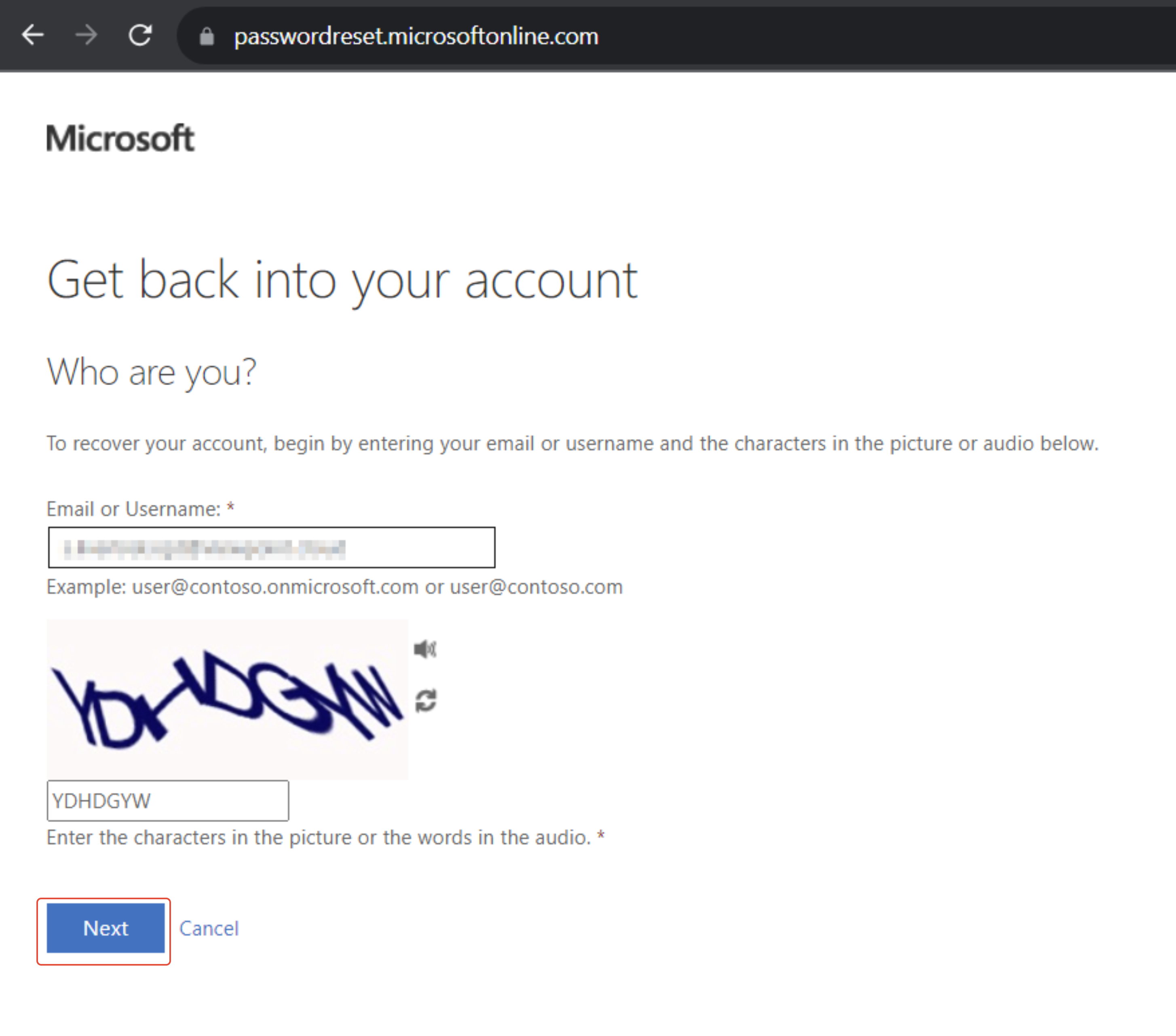 - You can now reset your password at https://passwordreset.microsoftonline.com/ using the same email set up in the steps above (firstinitial.lastname.companycode@viewpoint.cloud) and hit Next