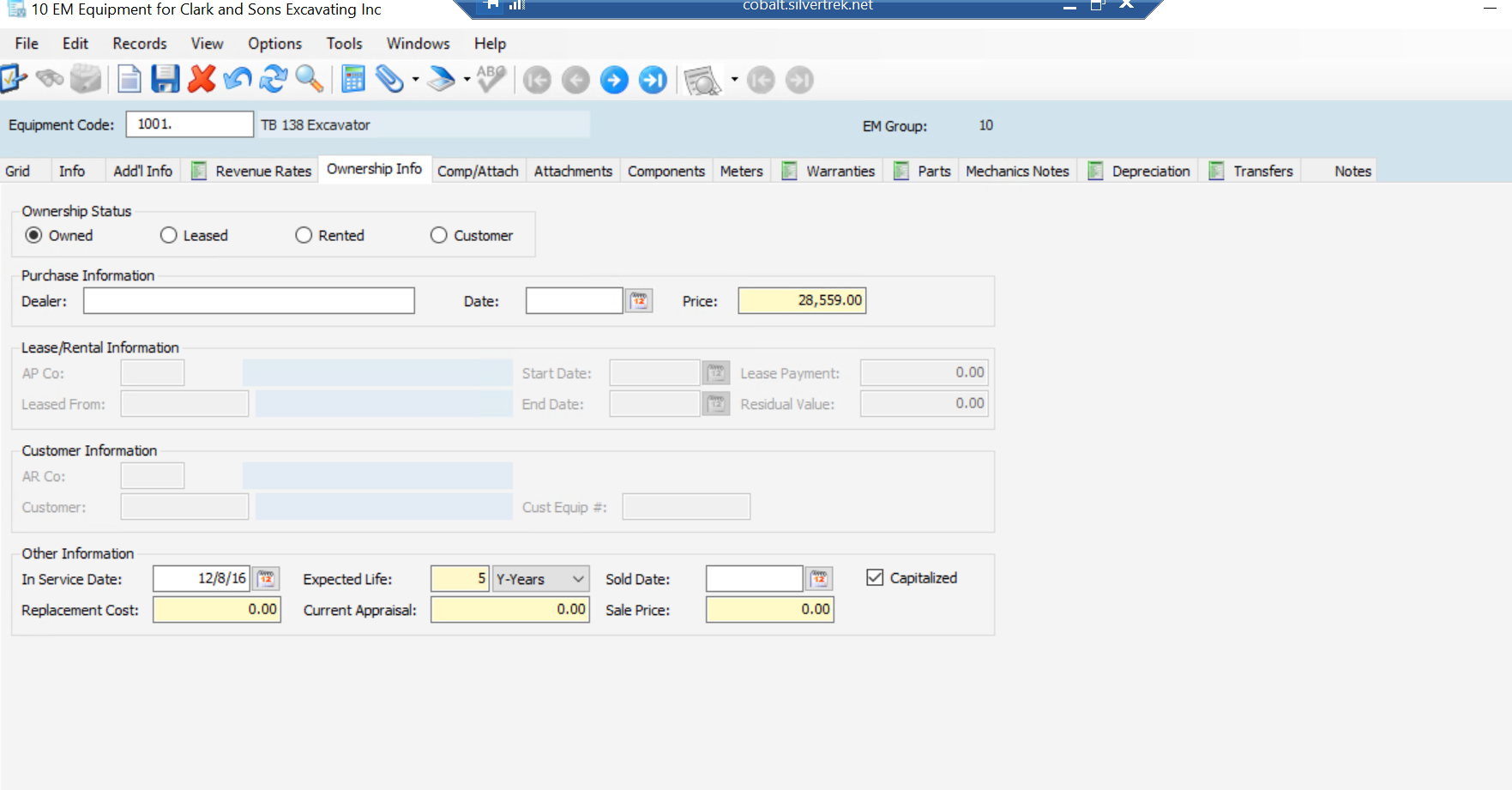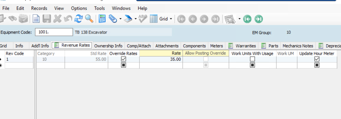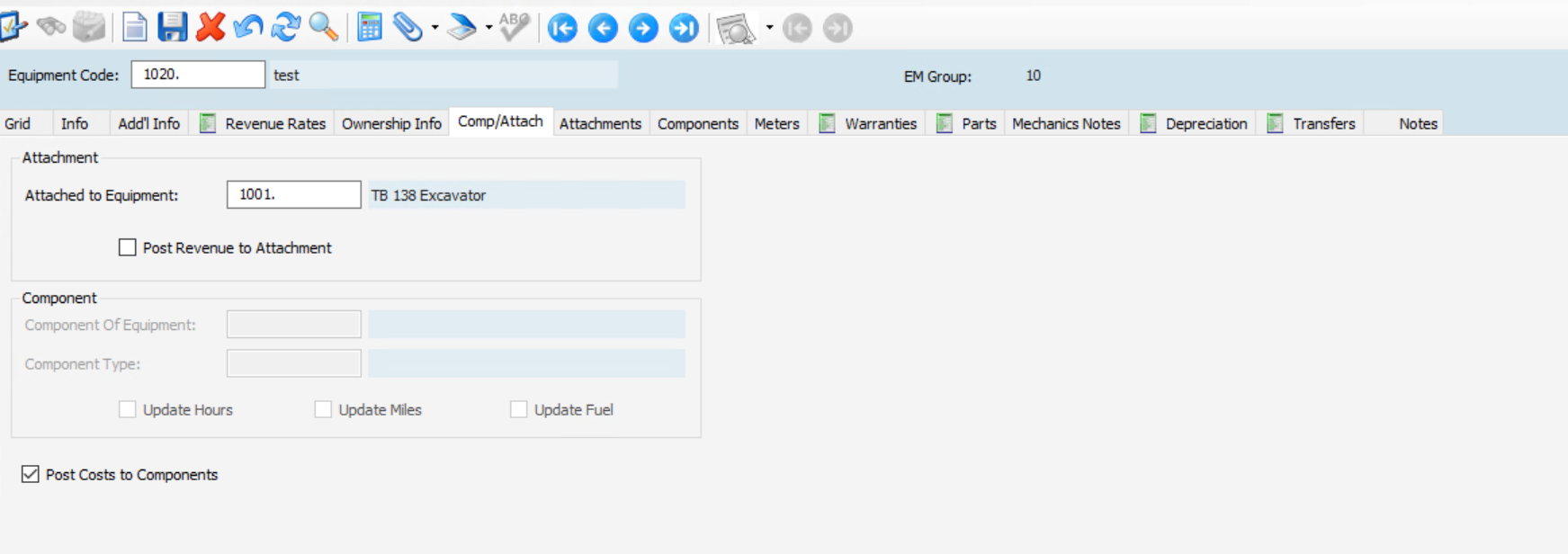 You will set up a new Equipment Code and then enter here what piece of equipment it belongs to. Post Revenue to Components