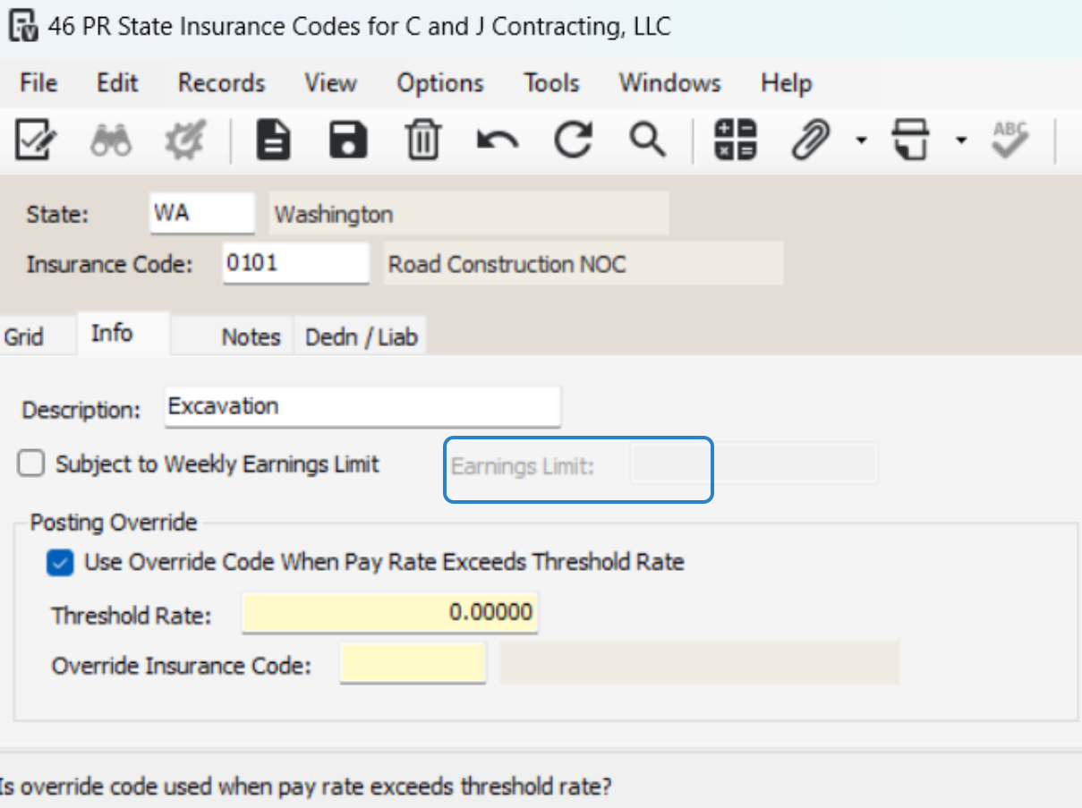 If the employee's combined pay rate and add-on earnings meet or exceed this rate, the override insurance code is used. Otherwise, the standard insurance code for the employee is applied. - Override Insurance Code: