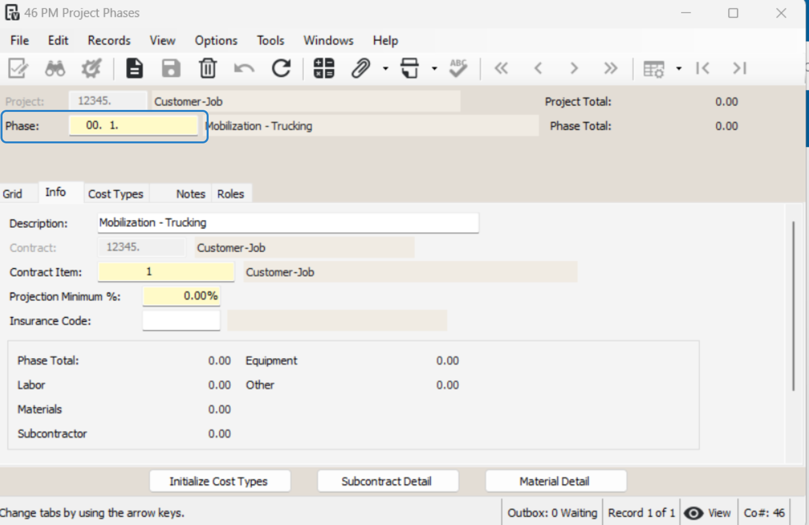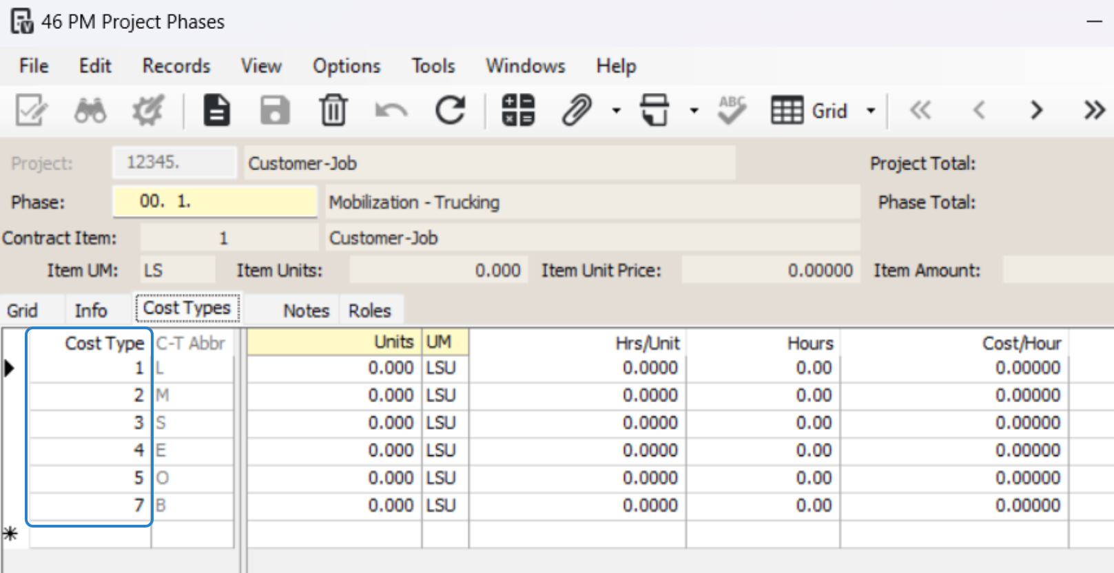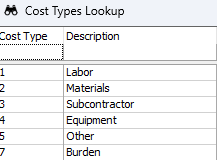 Click the 'initialize cost types' button to automatically set up cost types connected to the phases.