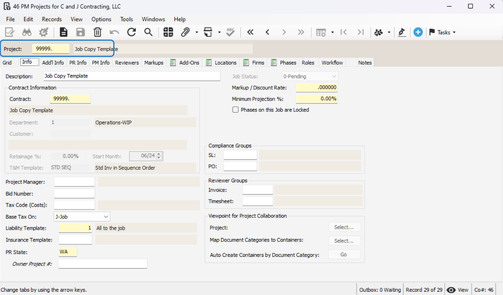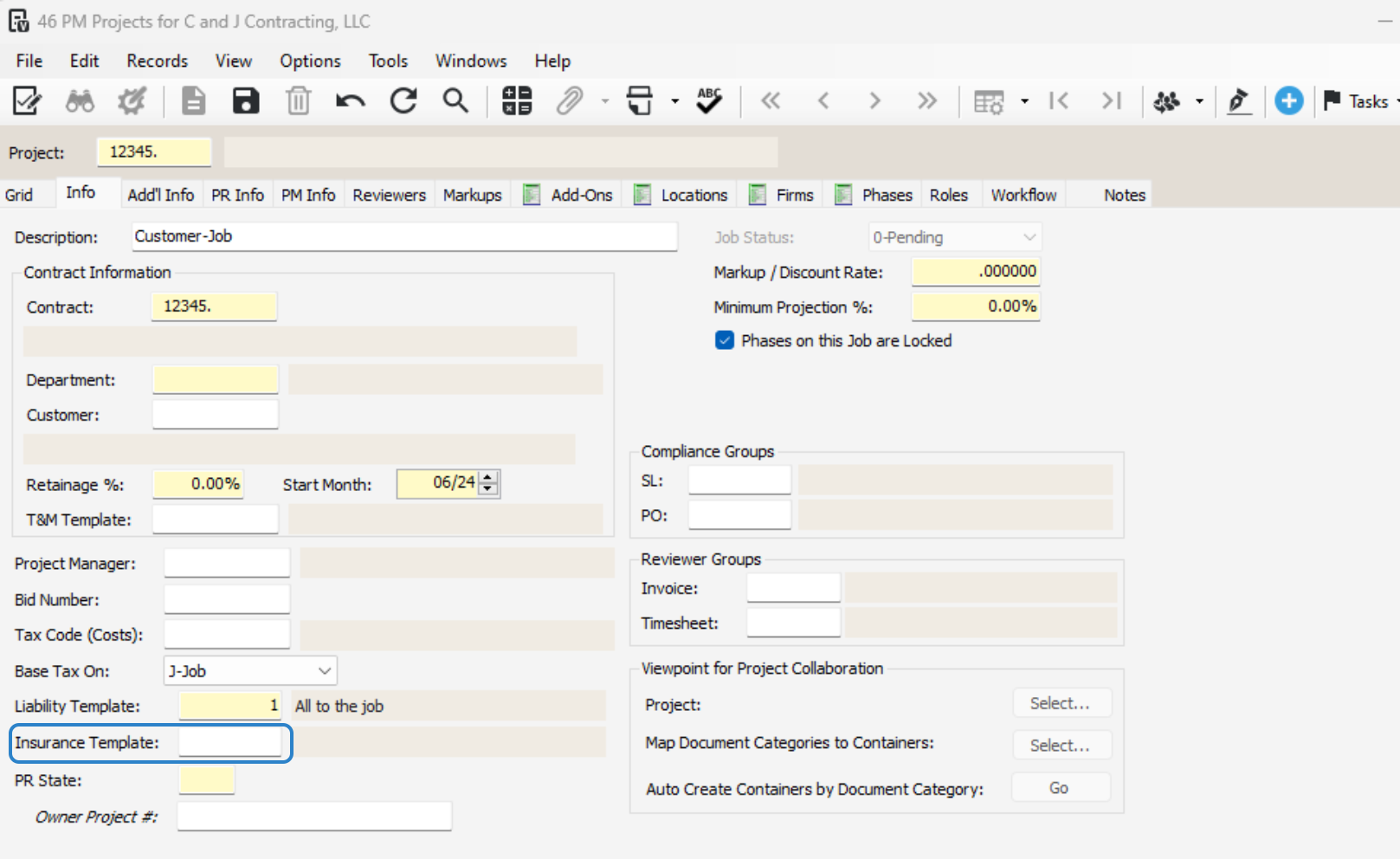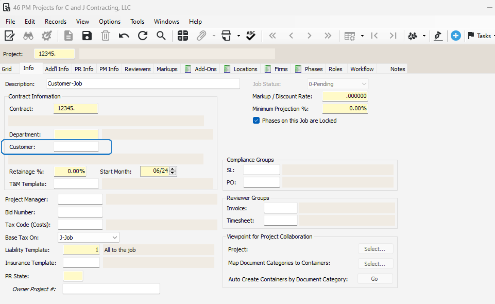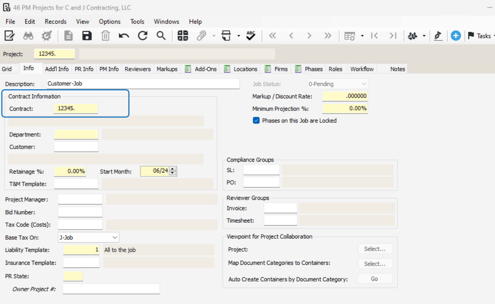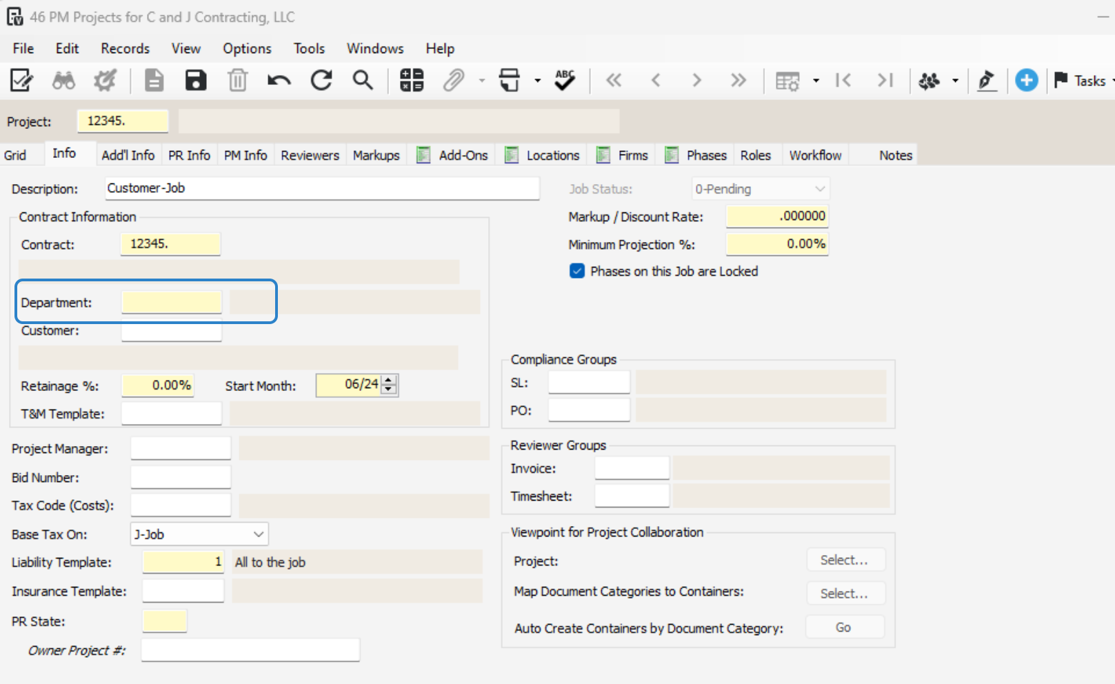 Review the auto-created contract number, department, customer, retainage, and start month.
