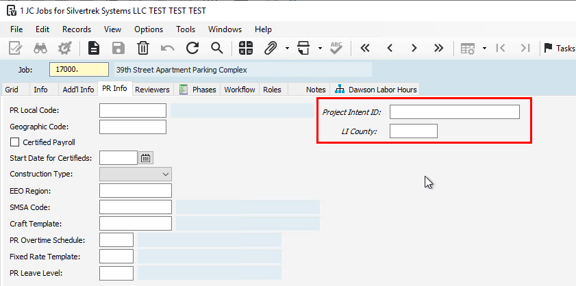 In JC Jobs, there are two custom fields. To use the Certified XML Export button for the job, you must provide appropriate values for both Project Intent ID and LI County fields.