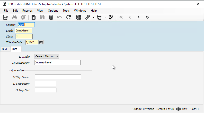 The UD PR Certified XML Class Setup custom table exists to link the Vista Craft/Classes to the mandated WA L&I Trades/Occupations. For all Craft/Class combinations working certified time to a job, you must create rows here with the appropriate values.