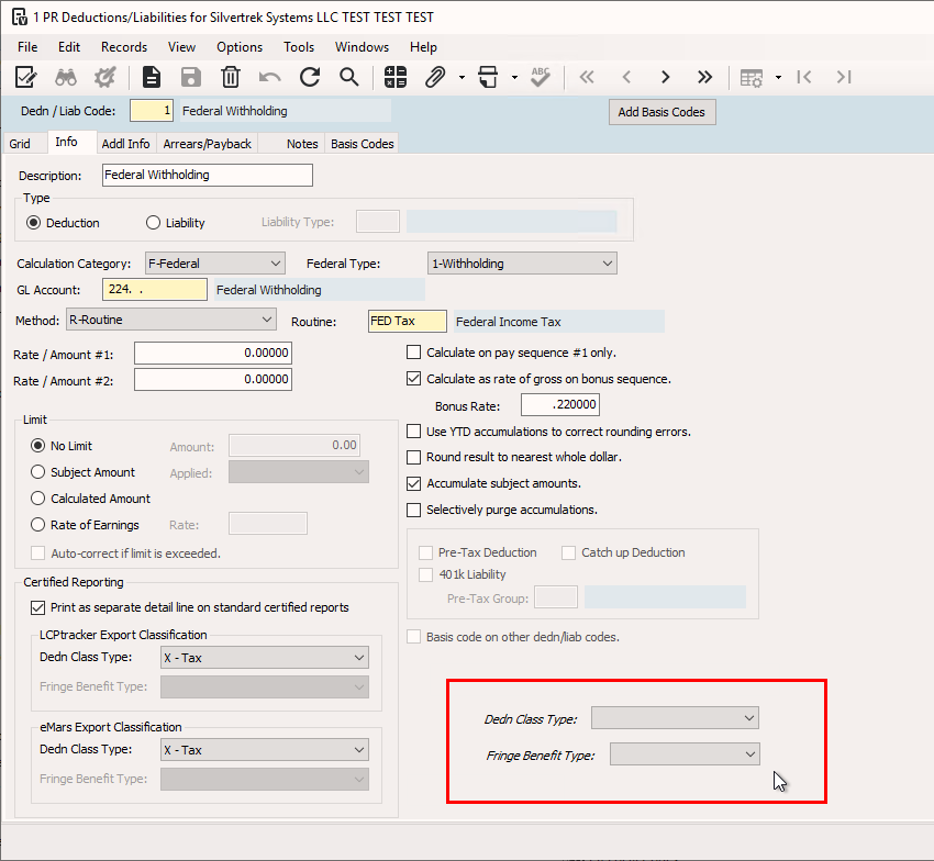 - For deductions that would be included in the tax reporting section of the website, choose “X – Tax Withholding” and leave the Fringe Benefit Type blank. Examples: Federal Tax withholding, Social Security, Medicare, Additional Medicare. Note: PR Federal Information is where it looks to determine which "X" type code represents each of (Federal Tax withholding, Social Security, Medicare, and Additional Medicare). Note: The button now uses the Dedn Class Type under LCPTracker Export Classification for the "X" determination.