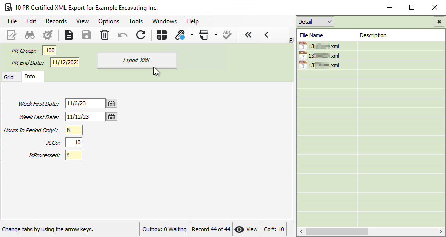 Click the “Export XML” button. This will generate XML export files for each job found to have certified payroll time in the pay period, making a series of attachments onto this form. The attachments have filenames that are the Project Intent ID of the job followed by the .xml file extension.