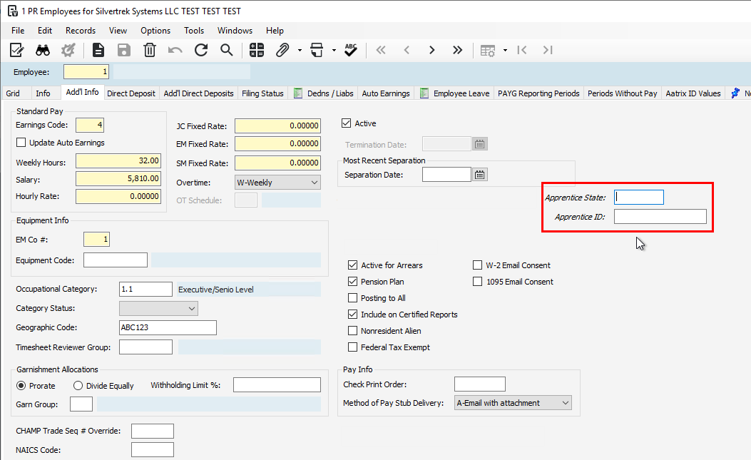 In PR Employees, there are two custom fields. If you have apprentices, you must provide appropriate values for their Apprentice State and Apprentice ID.