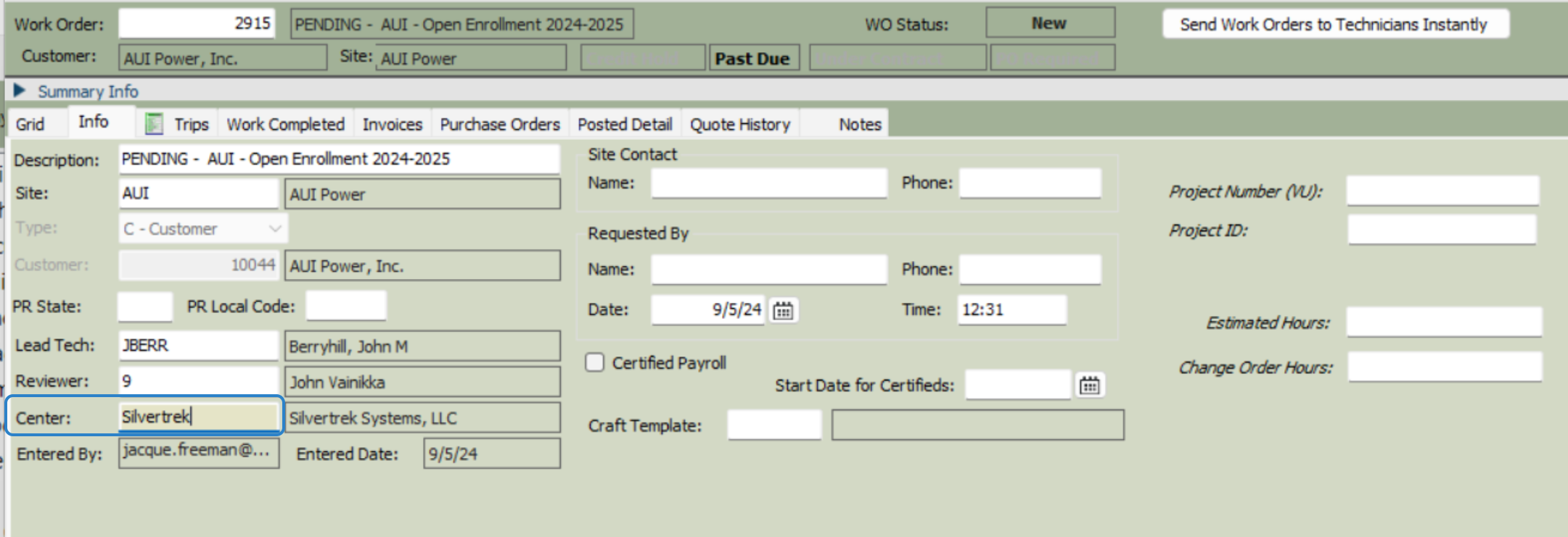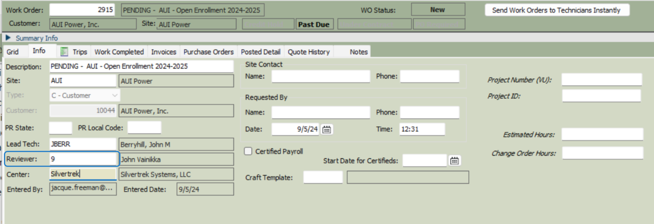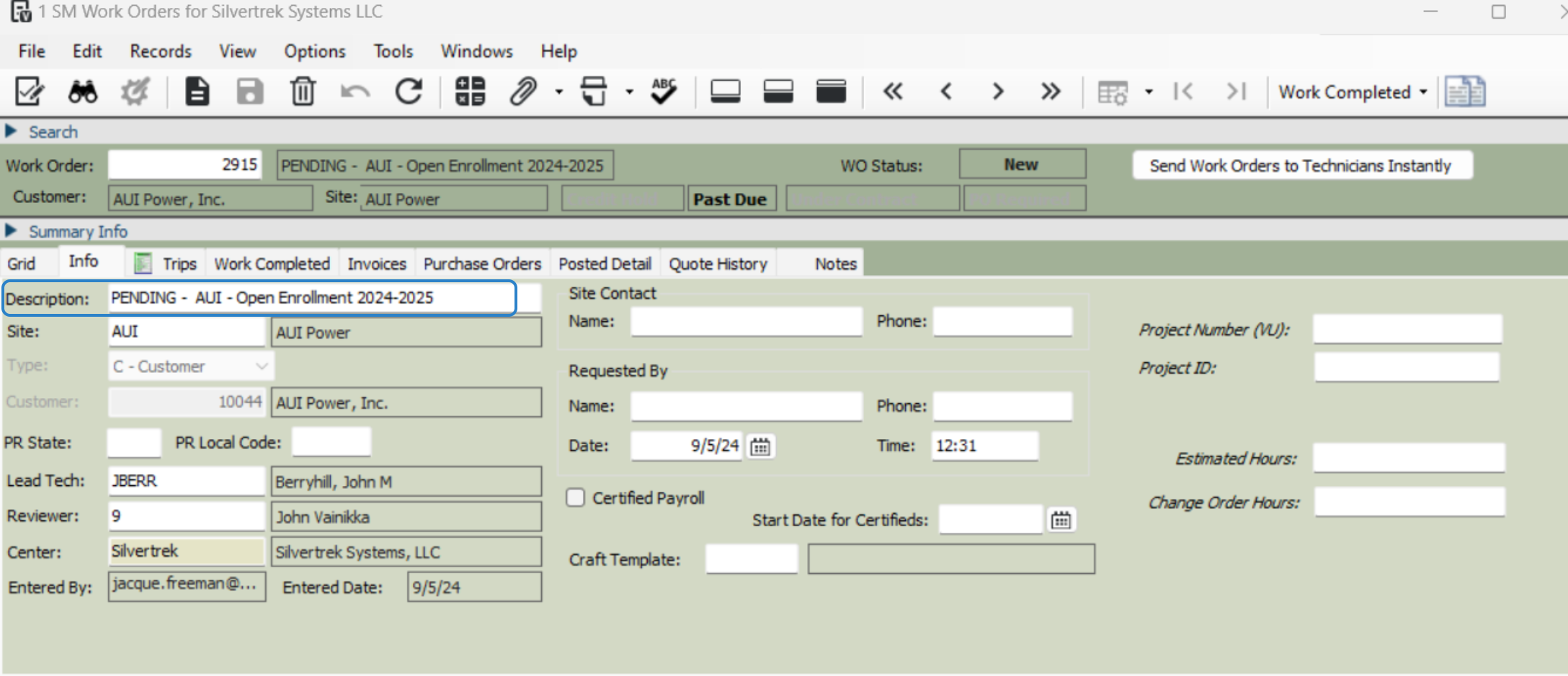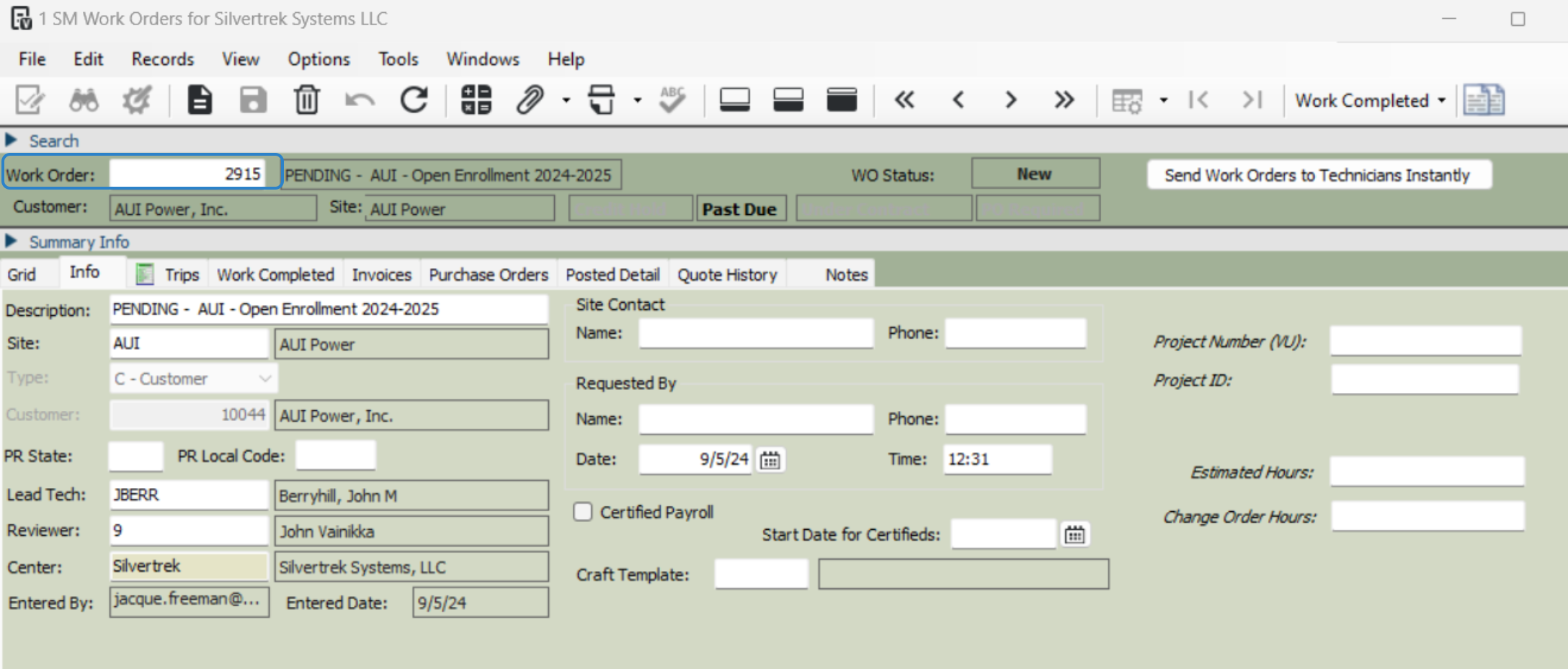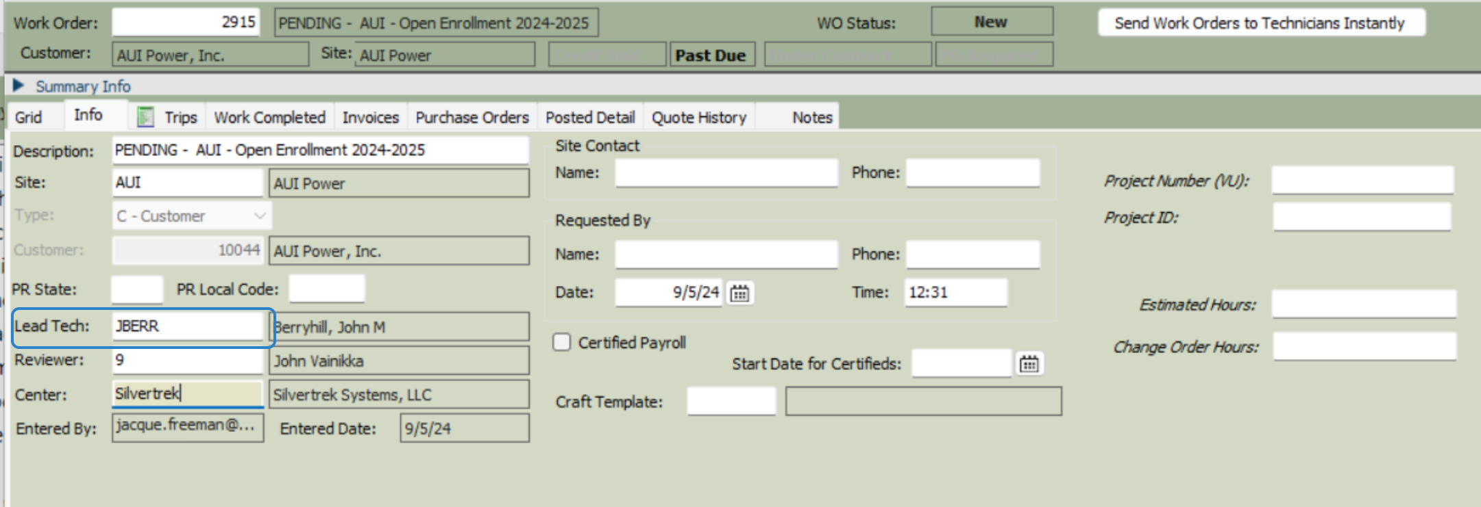SMWO5. Lead Tech: press f4 to select the technician responsible for the work order