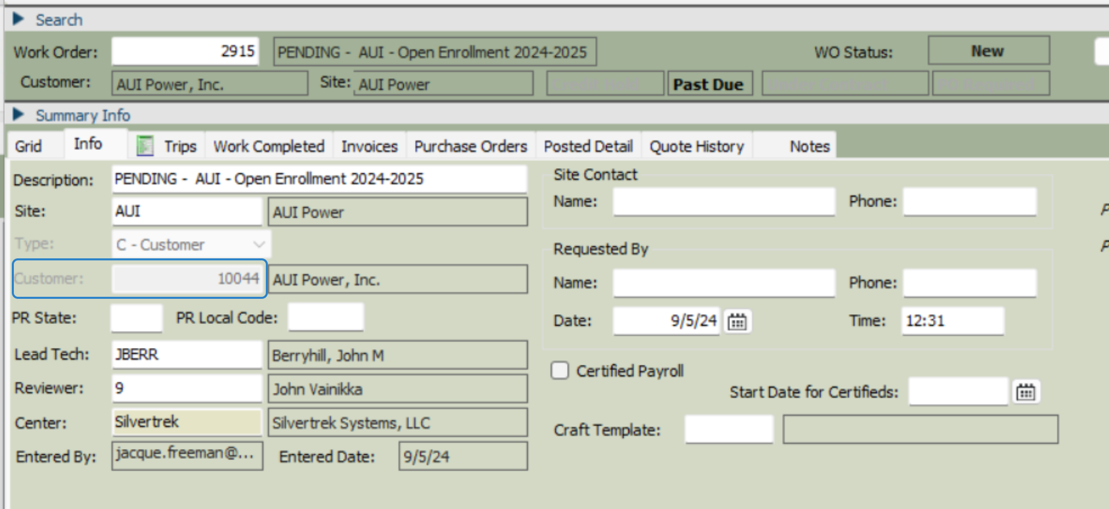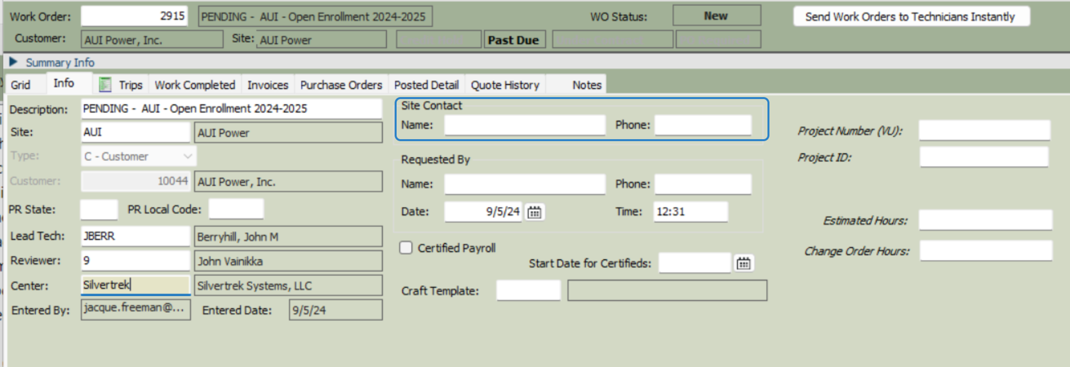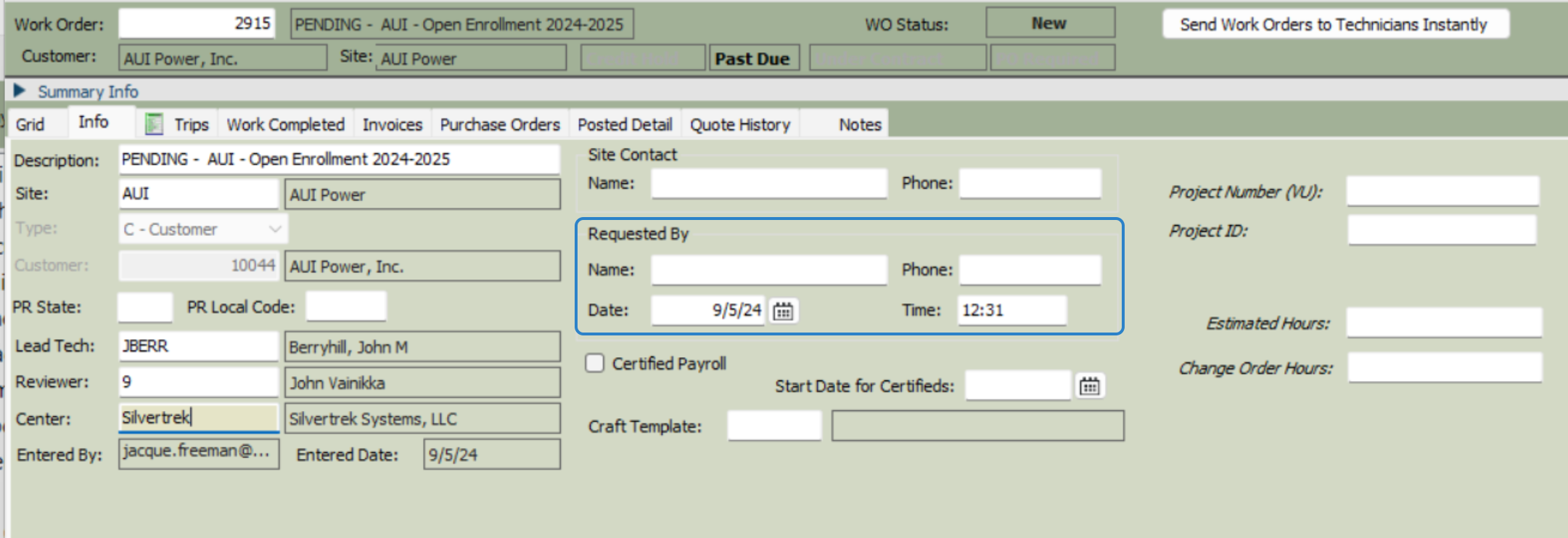 SMWO9. Requested By(name, phone): This will be the customer contact who requested the work order (date and time should auto populate)