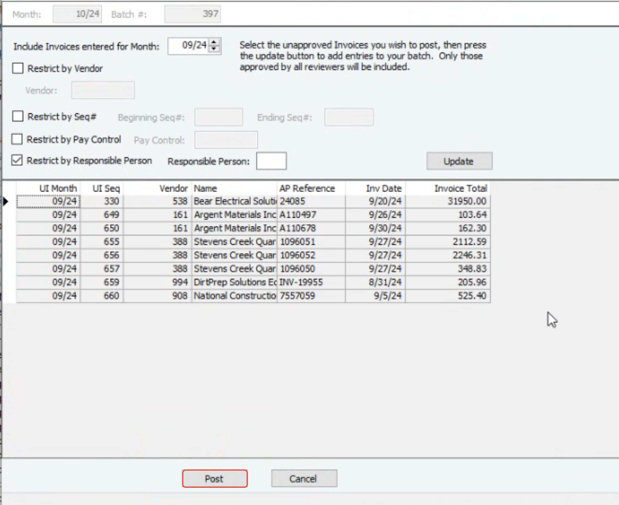 5. Verify these invoices look correct and they are what you intend to post