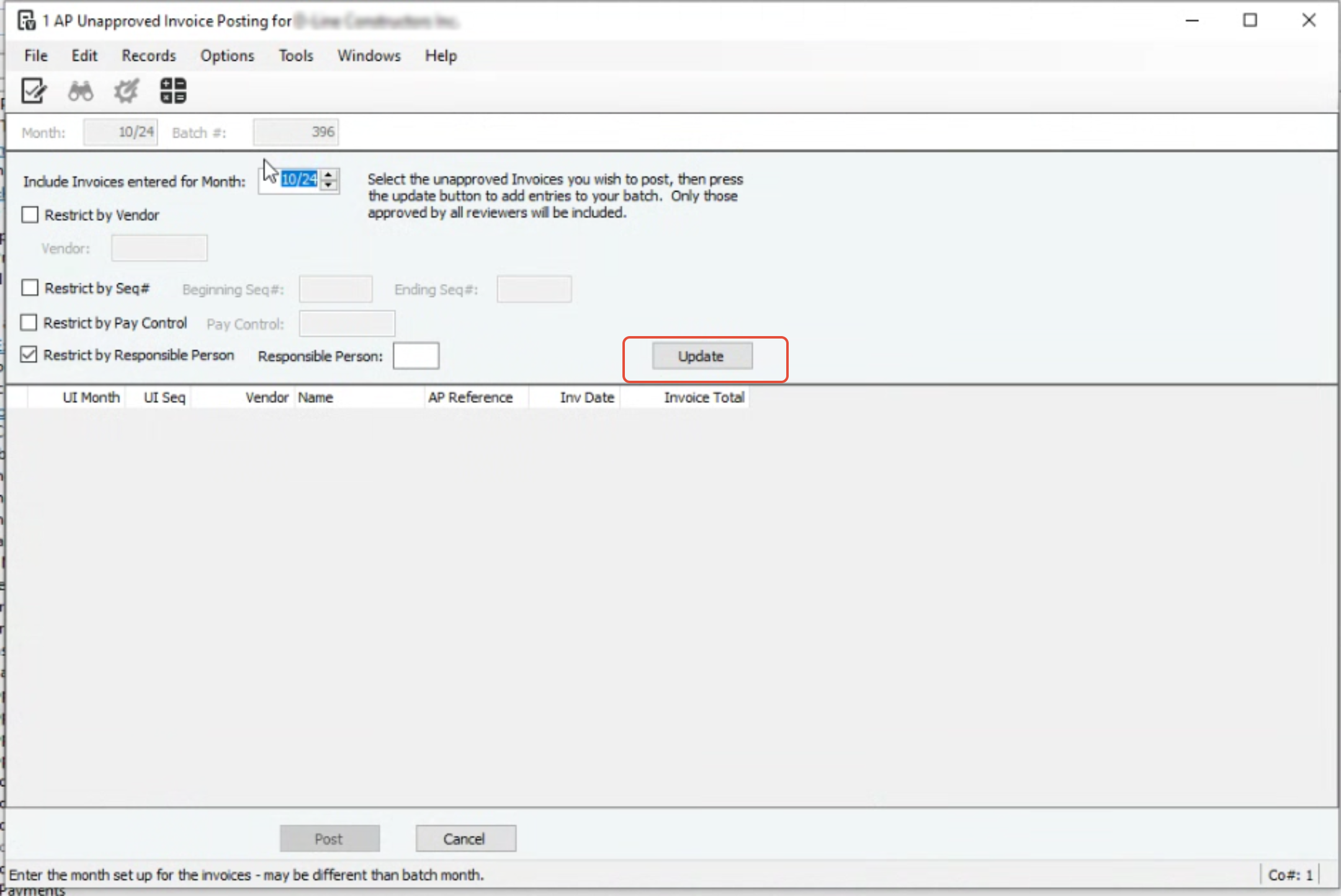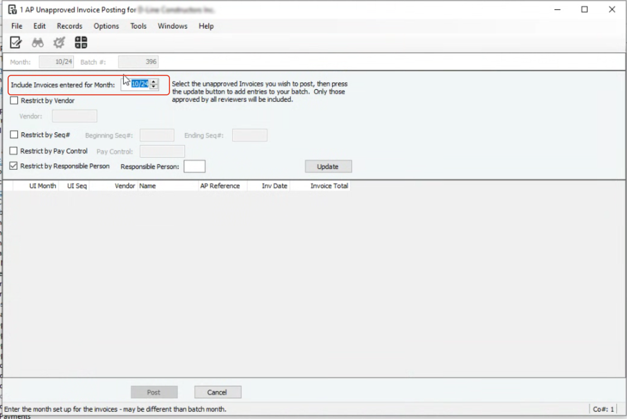 This is the batch month you want the invoices posted in. If the month is closed, select the oldest open month you have open.