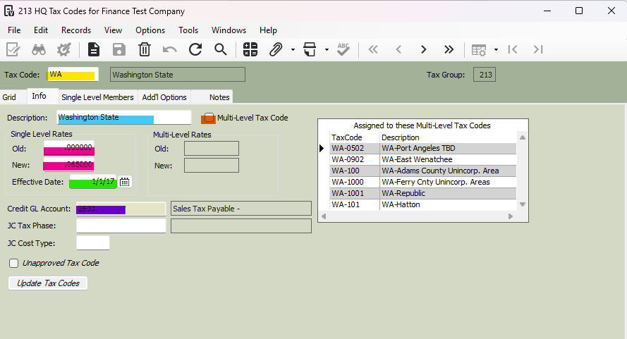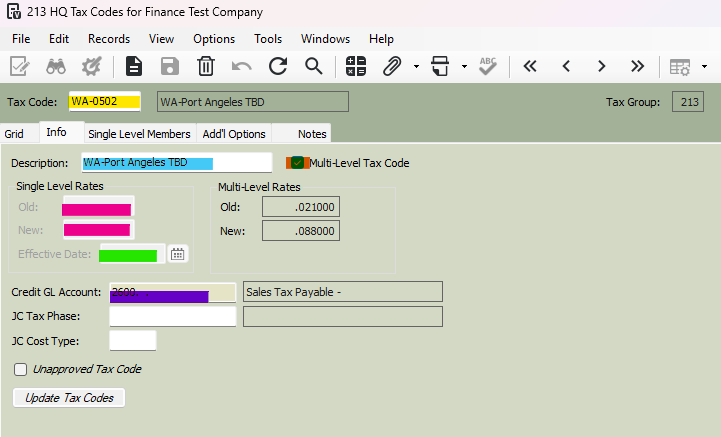 Purple: Credit GL Account, select the specific tax liability account you use. If you're unsure confirm with your Accounting Manager/Controller the GL this needs to go to.