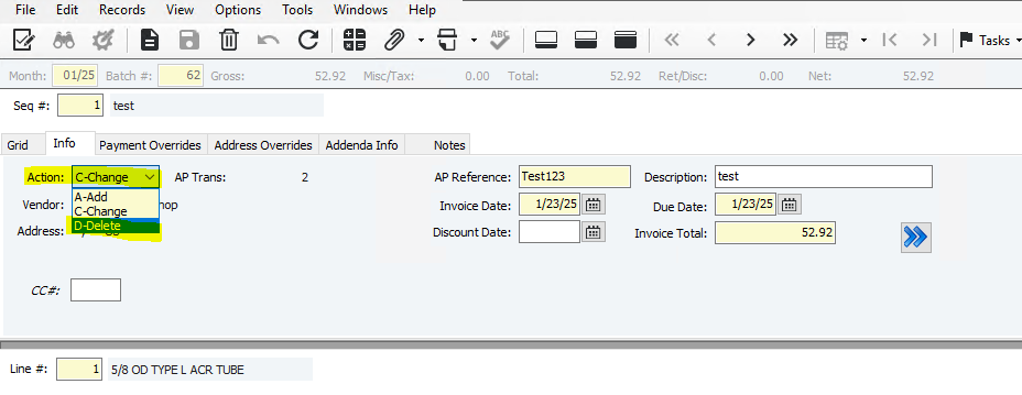6D. Click the dropdown menu next to "Action:" and select Delete