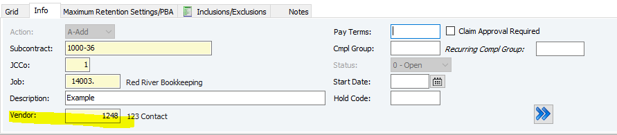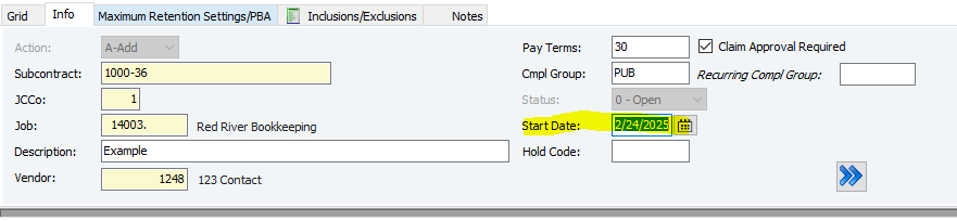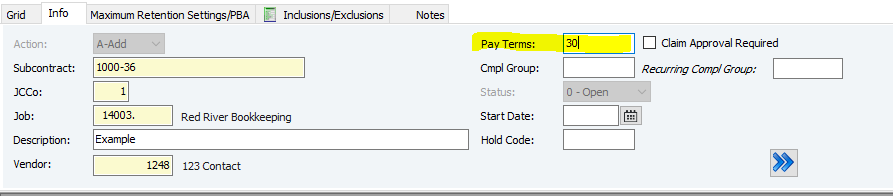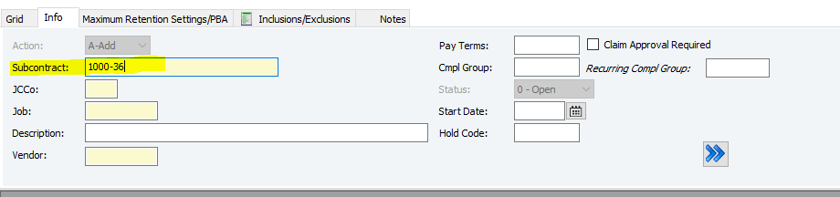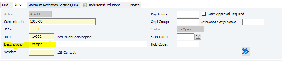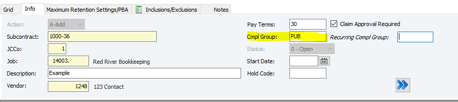 10. Enter the Compliance Group (Cmpl Group) if necessary - a compliance group is a set of requirements (like insurance or licenses) that subcontractors must meet to receive payment. If they aren't met, the invoices can't be paid. (You can F4 in the Cmpl Group cell to see preset options)