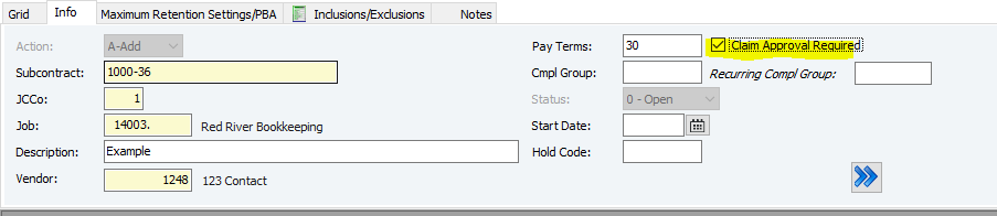 9. Check off the "Claim Approval Required" if necessary (Claim Approval Required if checked off, will require any invoices for the subcontract to be approved before they can be paid)