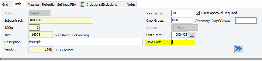 12. Enter a hold code if necessary - a hold code will temporarily prevent payments or processing of the invoices for the subcontract until specific conditions are met. It can be removed at any time.