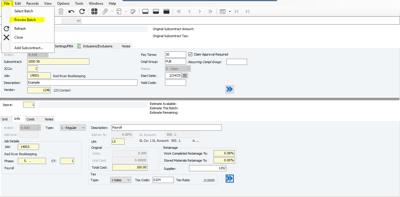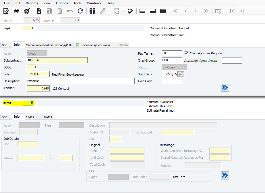 19. Enter the total cost for the subcontract item and the retainage/supplier according to the contract (you can use F4 in the Supplier box to search for suppliers)