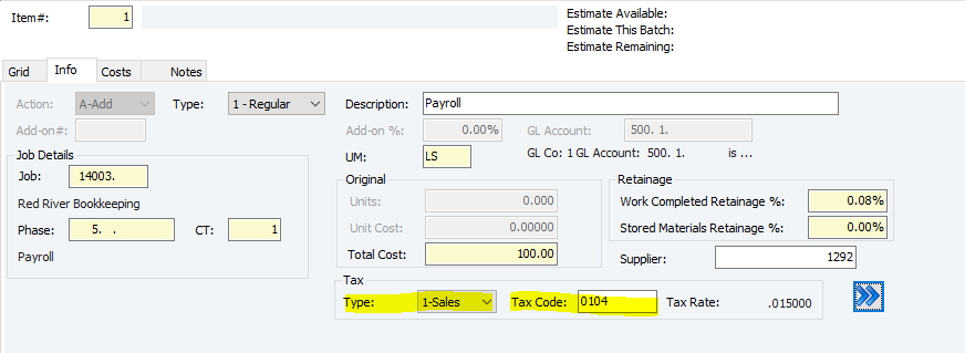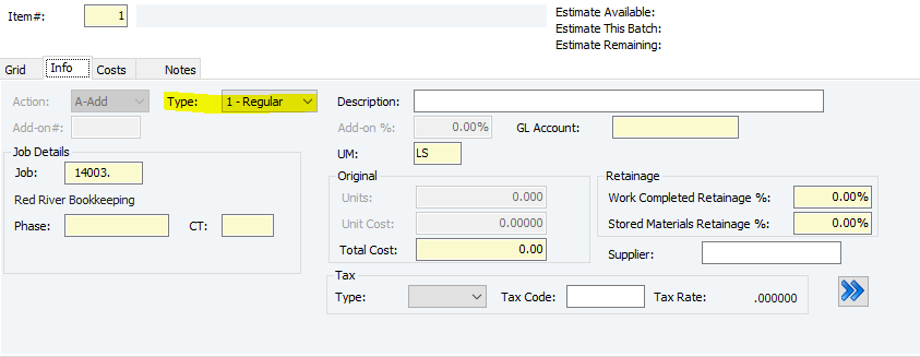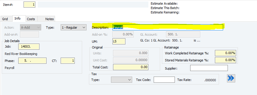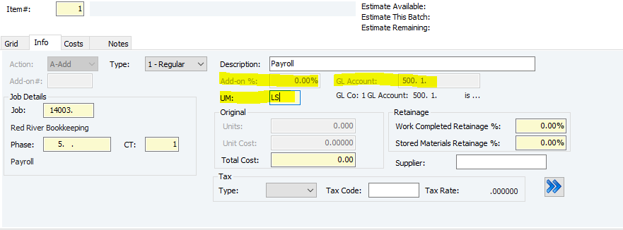 18. Add on % and GL Account will autofill according to your phase and cost type - they won't be changeable. You can however, change the UM (unit of measurement) if needed.