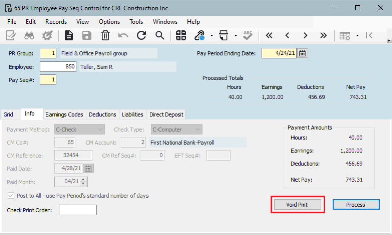 NOTE: If you previously ran the PR Ledger Update, you should run it again at this point to remove the payment from CM and GL before making changes and re-issuing.