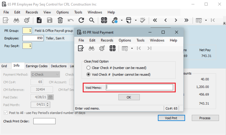 4. Choose Void Check # (number cannot be reused), enter a Void Memo if needed, click OK.