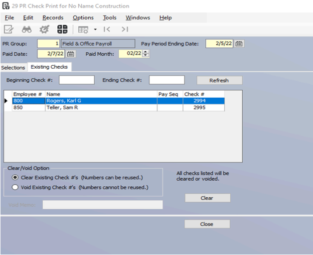 You may enter one check as a beginning or ending check to void, you may enter a series of checks to void, or you may leave the fields blank to void all checks.