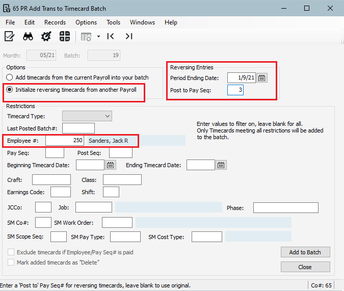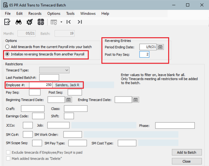 6. Enter the period ending of the incorrect check and enter the unique pay sequence that you want to post a timecard to. In the below example that sequence is #2
