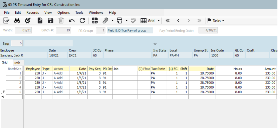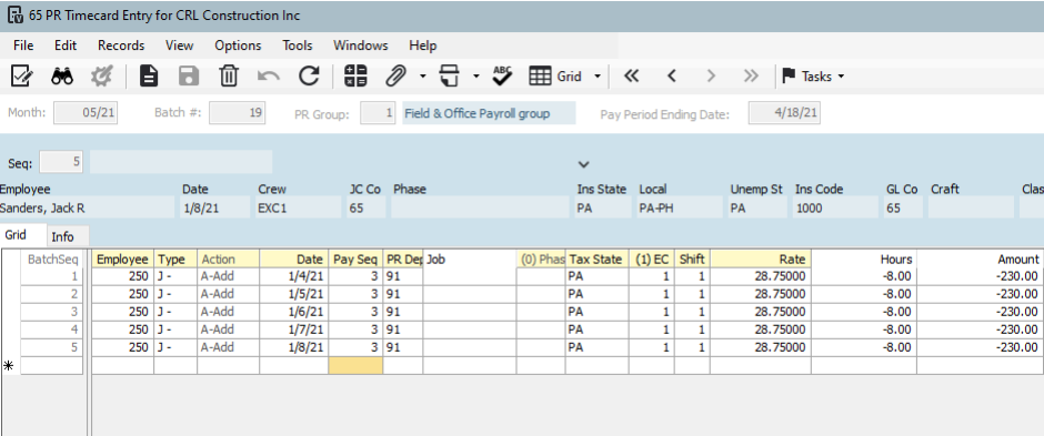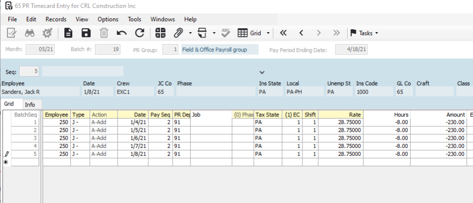 In this example, employee Jack Sanders #250 was paid on the pay period ending 01/09/21. A replacement will need to be made on the pay period ending 04/18/21.