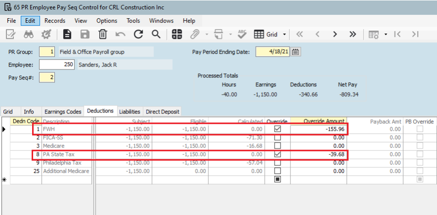 11. In employee pay sequence control be sure to check the earnings codes, deductions, and liabilities to ensure that the amounts are showing as negatives, Also, you will need to make sure that the amounts an exact match to the original payroll register from the original pay period, only negative. If they don't match click in the "override" box and add the negative amount to match the payroll register report. Routine-based deductions such as Federal Withholding will not post on negative earnings so this must be overridden to the negative equivalent of the original deduction.