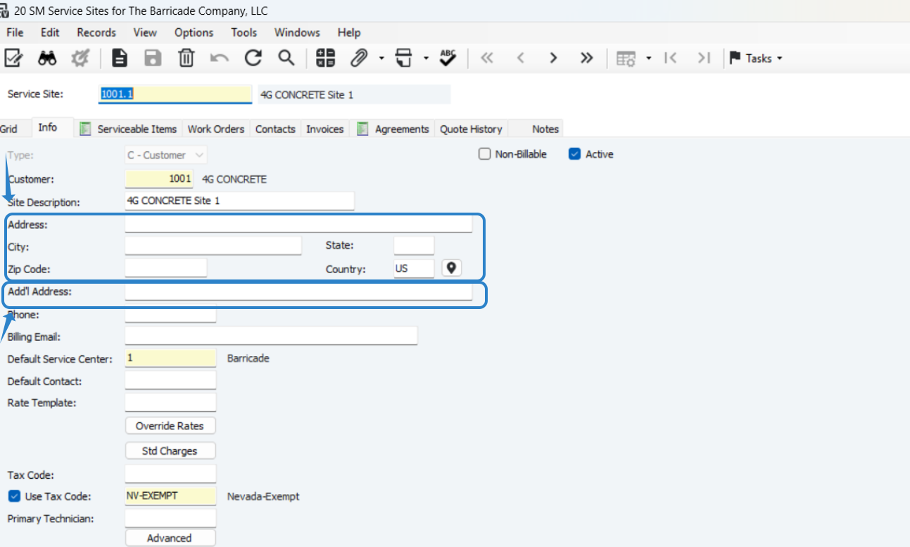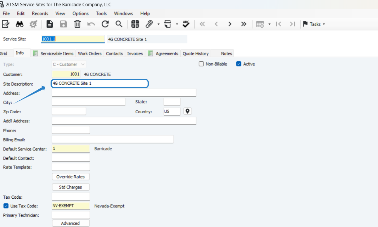 This will calculate sales tax on work done at this service site if the work order is set to use the Service Site for tax.